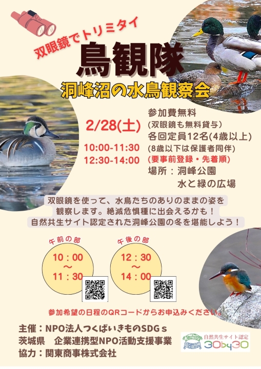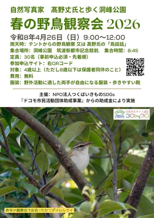 The NPO " Tsukuba Ikimono SDGs" will hold a bird observation event at Doho Park on Saturday January 31st (9:00 AM~10:30AM).